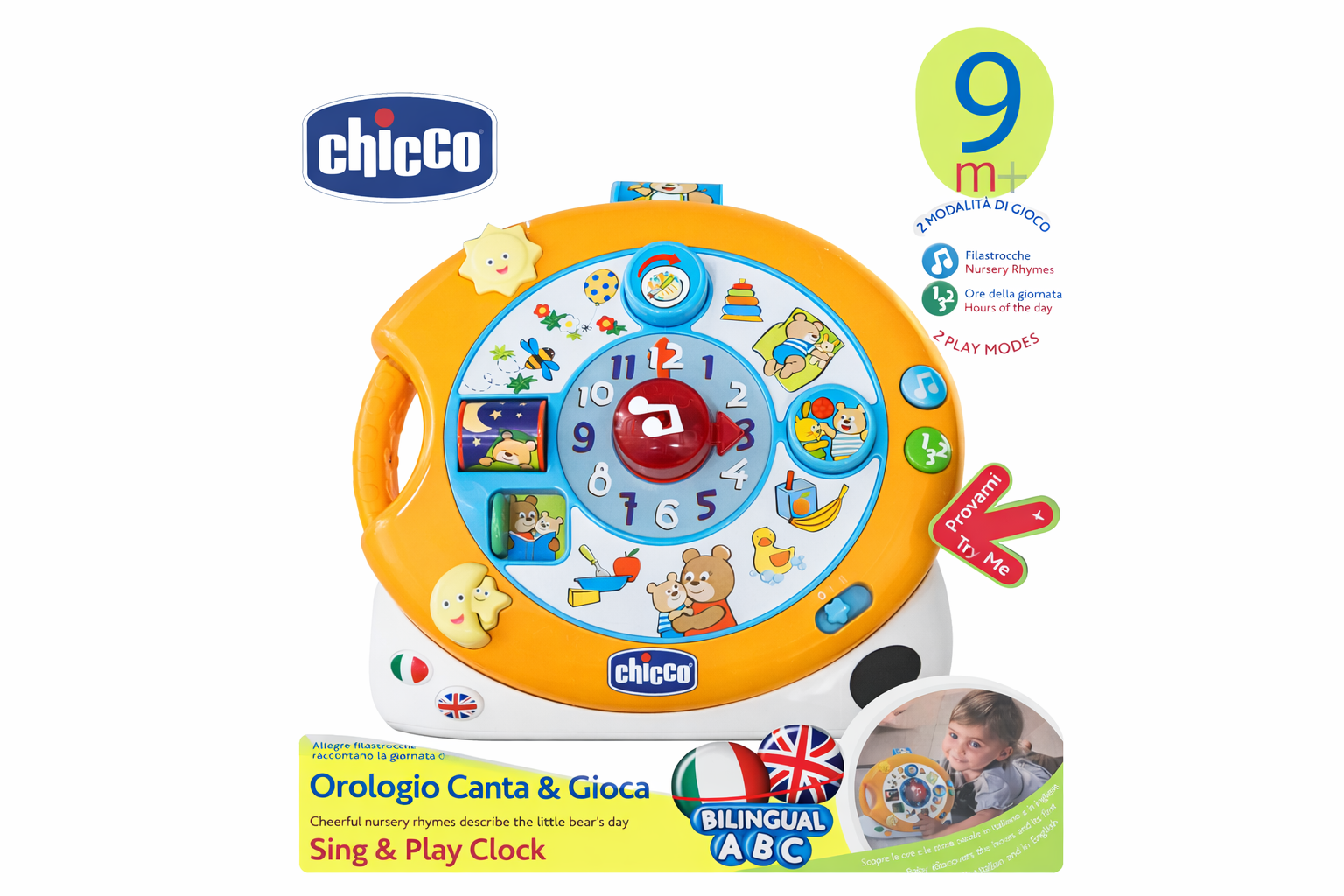 Il primo orologio del tuo bambino per imparare le ore e le prime parole in italiano e inglese.