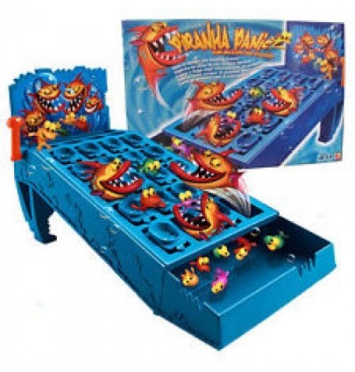 Ad ogni giocatore vengono distribuite tre pesci-biglie. Tirate il dado per muovere il vostro pesce. Il dado indica inoltre il momento in cui i piranha verranno liberati. Attenzione: quei piranha affamati sono pronti ad attaccare chiunque si trovi sulla loro strada! Vince il primo giocatore che avrà portato in salvo i propri 3 pesci.