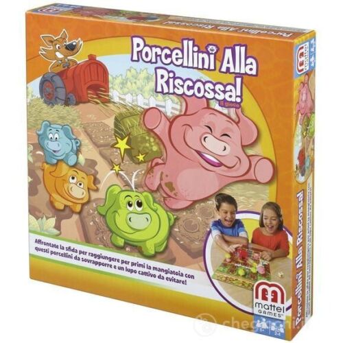 MATTEL – PORCELLINI ALLA RISCOSSA Gioco in scatola per bambini dai 5 anni. Affrontate la sfida per raggiungere per primi la mangiatoia con questi porcellini da sovraporre a un lupo cattivo da evitare
