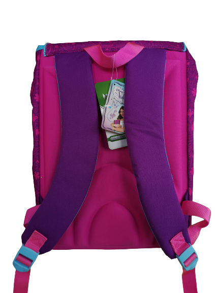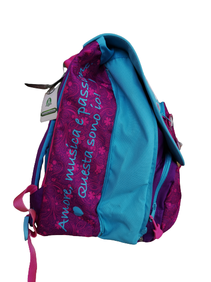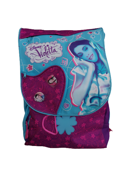 Zaino di Violetta estensibile con tasca a cuore sulla patella e due spille (non amovibili). Ideale per la scuola primaria.